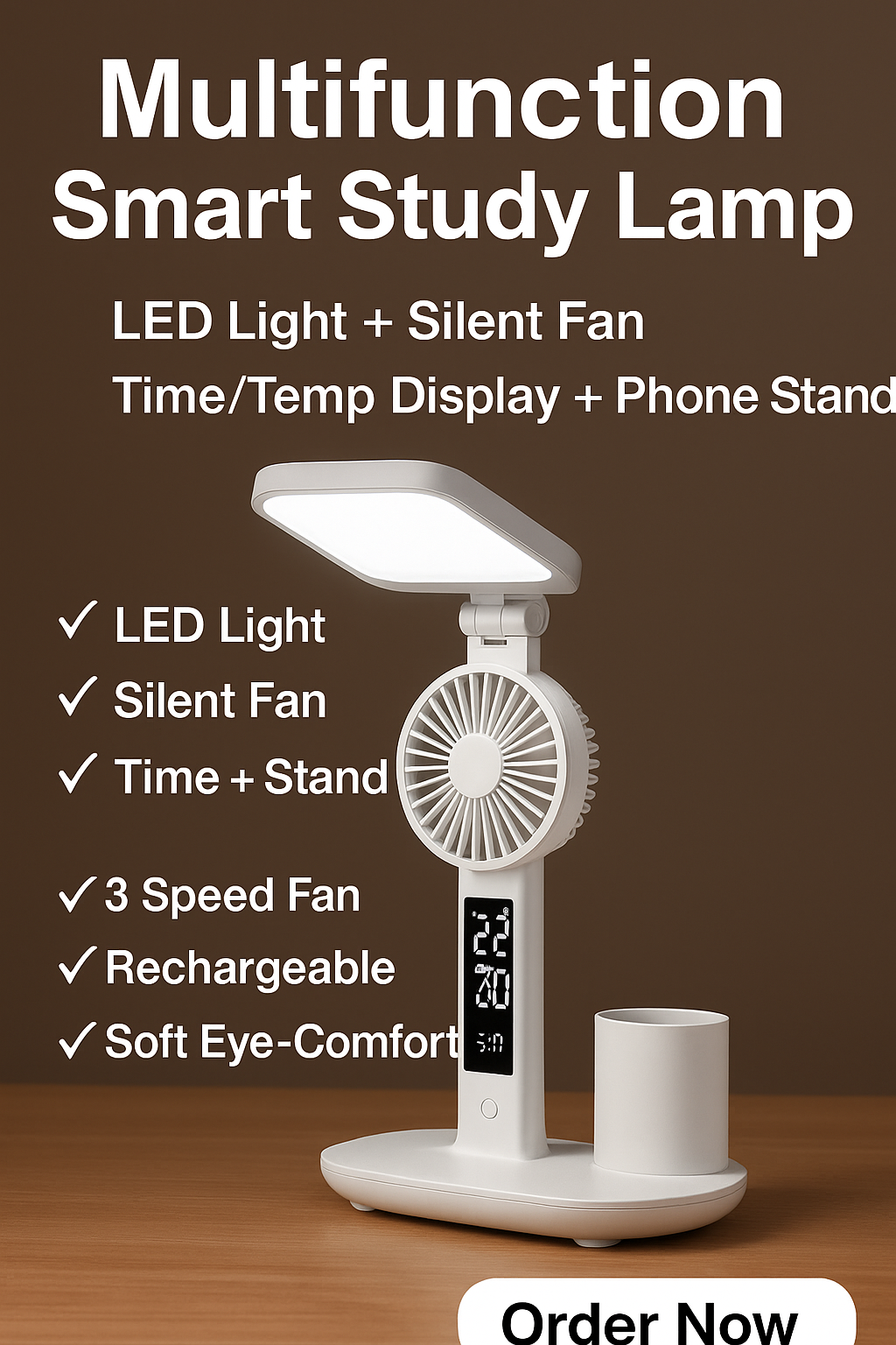 এই স্মার্ট মাল্টি-ফাংশনাল টেবিল ল্যাম্পটি শুধু আলোই দেয় না—এটি একই সাথে ঘড়ি, ক্যালেন্ডার, তাপমাত্রা মিটার, ফোন স্ট্যান্ড ও সাইলেন্ট ফ্যান হিসেবে কাজ করে! স্টুডেন্ট, অফিস ও হোম ডেস্ক—সব জায়গায় এটি আপনার এক কমপ্লিট সলিউশন।